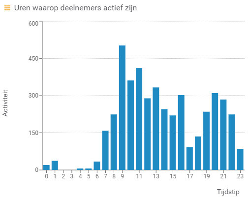 De populairste periode is trouwens tussen 9u en 12u; dan zijn mensen het meest actief op Qurve. Na de middag zien we ook nog een mooie activiteit, maar van zodra de klok voorbij 17u gaat, merken we een terugval. Logisch, mensen gaan naar huis en hebben andere verplichtingen (avondeten, kinderen, hobbies, …) Die mindere activiteit duurt dan 9u de volgende dag, zou je zo denken. Nope, , het duurt tot 20u, want dan zien we terug een stijging die een drietal uur duurt. Je leest het goed, tussen 20u en 23u hebben we terug behoorlijk veel activiteit. Mensen zijn bereid om niet enkel in het weekend, maar ook buiten de reguliere werktijden leerinhoud tot zich te nemen.