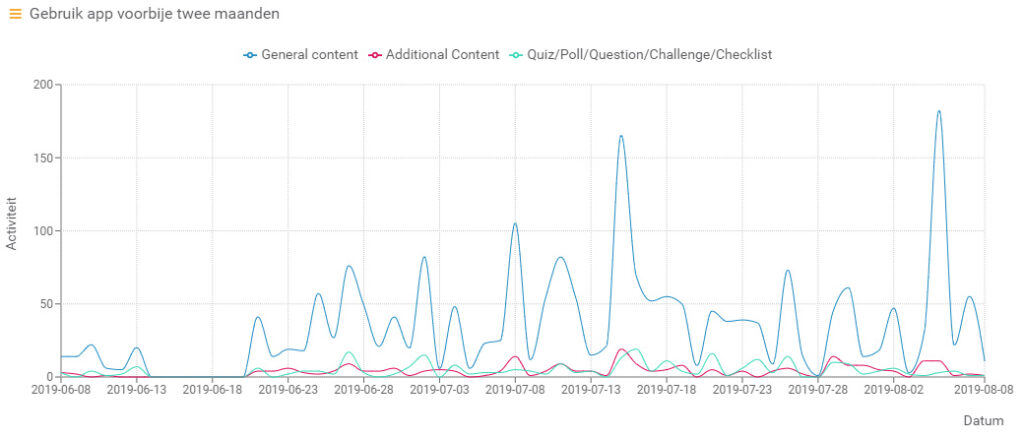 De tijdslijn toont ons dat we – op enkele dagen na medio juni – elke dag 1 of meerdere deelnemers hadden. En dan hangt het af van het type deelnemer hoe zij met de app omgaan. Sommige mensen checken quasi dagelijks in en bekijken het leermoment van die dag (en ondernemen eventueel een extra actie). Andere deelnemers checken dan weer slechts om de x-aantal dagen in om dan alle content van de voorbije periode tot zich te nemen. Maar terugkeren doen ze bijna allemaal.